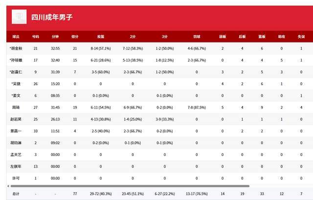 在浙江队强大的防守下,周琦11投6中,只拿到19分9篮板,胡金秋14投8中,拿到21分6篮板,孙铭徽21投6中,拿到15分4篮板5助攻,赵岩昊13投4中,拿到11分。