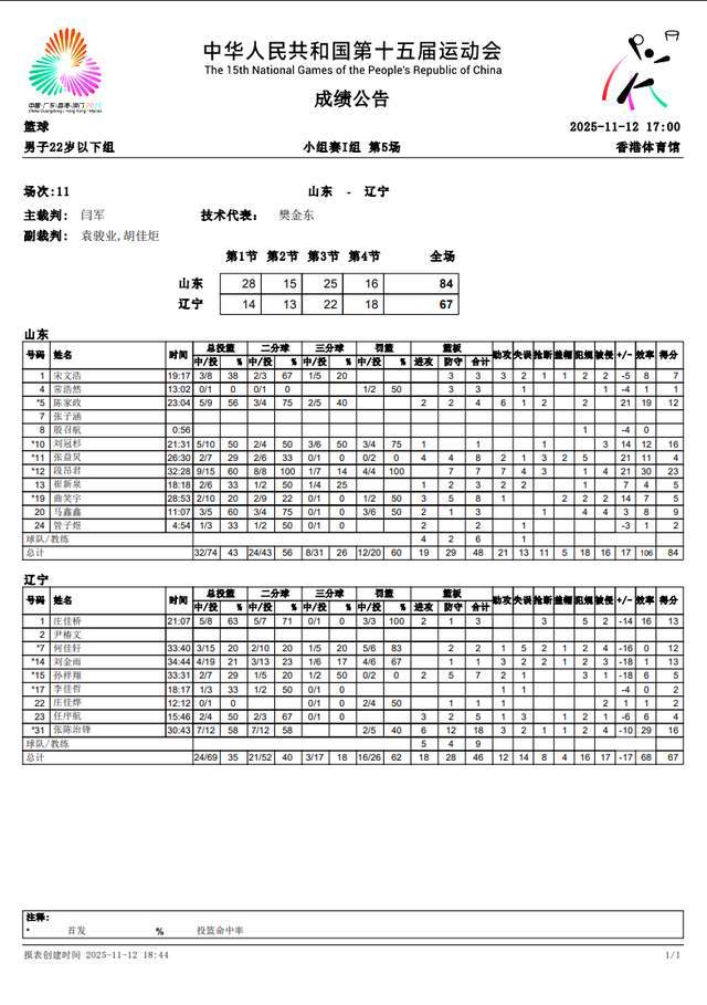 2025年11月11日 全运男篮-广东大胜辽宁进决赛 沈梓捷15+14 高诗岩22分