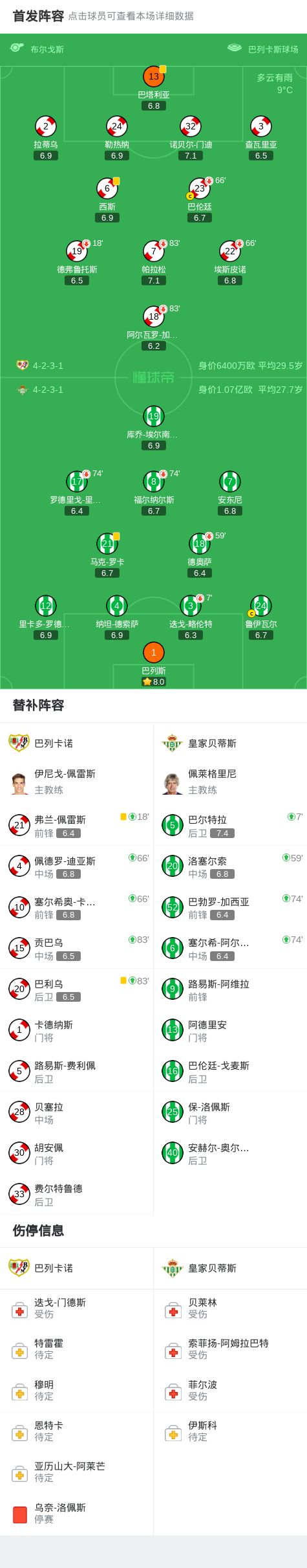 巴利卡诺0-0贝蒂斯,帕拉松中柱,略伦特、德弗鲁托斯伤退