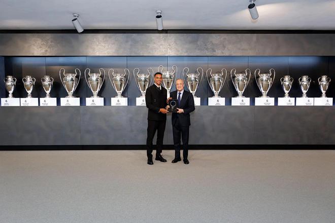 直播吧06月12日讯 今日皇马新援阿诺德抵达皇马体育城,完成了加盟皇马的签约和亮相仪式,随后阿诺德与皇马主席弗洛伦蒂诺合影,背后排成一排的15座欧冠奖杯非常抢眼。
